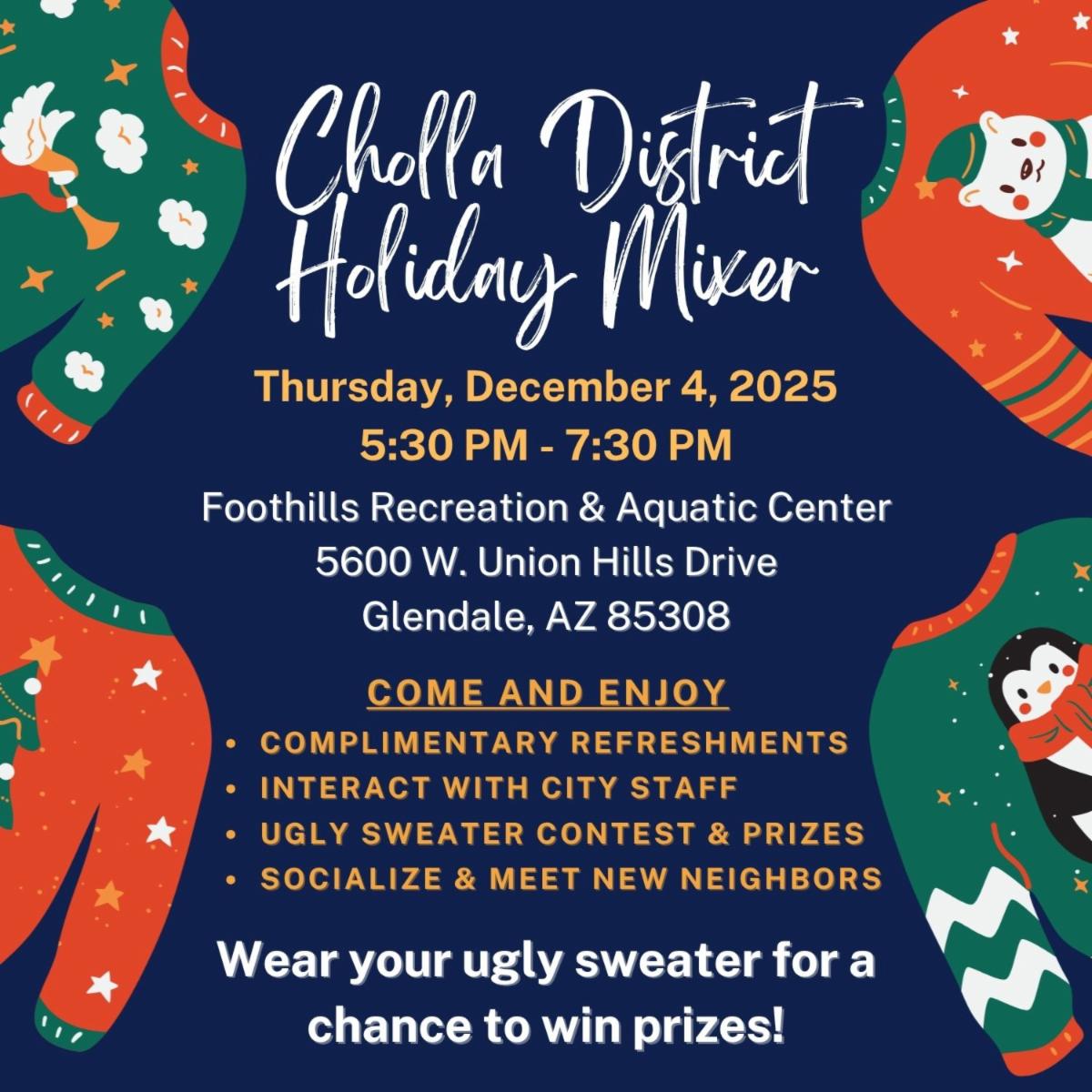 Cholla District residents are also warmly invited to RSVP for the 9th annual Cholla District Holiday Mixer on Thursday, December 4, 5:30 PM - 7:30 PM in the Coyote Room at the Foothills Recreation & Aquatics Center. Come enjoy refreshments, interact with city staff, and mingle with other neighbors in the district. Don't forget to wear your ugliest holiday sweater for a chance to win 1st, 2nd or 3rd place prizes with voting done by your fellow neighbors in the district. There will also be chances to win other prizes, including tickets to Glendale events. You must be a resident in the Cholla district to participate. Simply register online, or if you are unable to use the online form, contact Council Assistant Terri King for assistance. I look forward to celebrating the season with you!