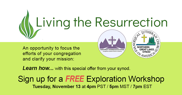 Come join the Northwest Intermountain and the Northern Great Lakes Synods in this extraordinary opportunity to focus the efforts of your congregation and clarify your mission. The entire series by congregational experts with Living the Resurrection will begin in January and has a $2000 value, but thanks to a generous gift from each synod, the series will only cost each congregation $50.