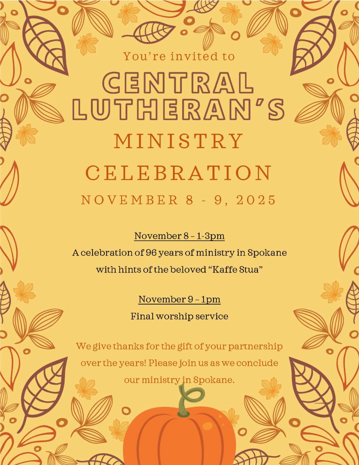 | | Final Celebration and Worship | You are invited to a celebration of 96 years of ministry and the final worship of Central Lutheran Church, Spokane. 512 S Bernard St, Spokane, WA 99204 | | |