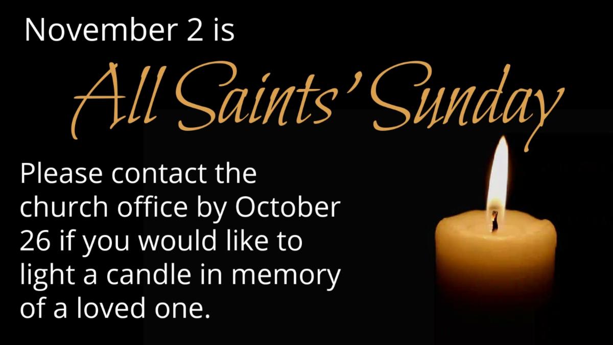 Sunday, November 2, is All Saints’ Sunday, a special time to honor and remember those who have gone before us. During the service, we will light candles in memory of loved ones who have died within the past year.
