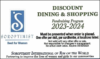 The Discount Dining & Shopping Card may be purchased on our website, from club members, and the Lake Arrowhead Chamber Office & Visitor Center in Lake Arrowhead Village. The card is good for one year and can be used as many times as the card holder wishes. When patronizing the restaurant or business, please present the card when order is placed and then the discount is applied.