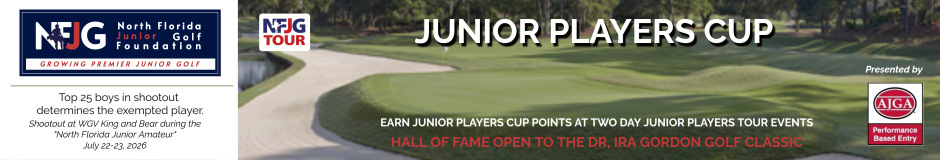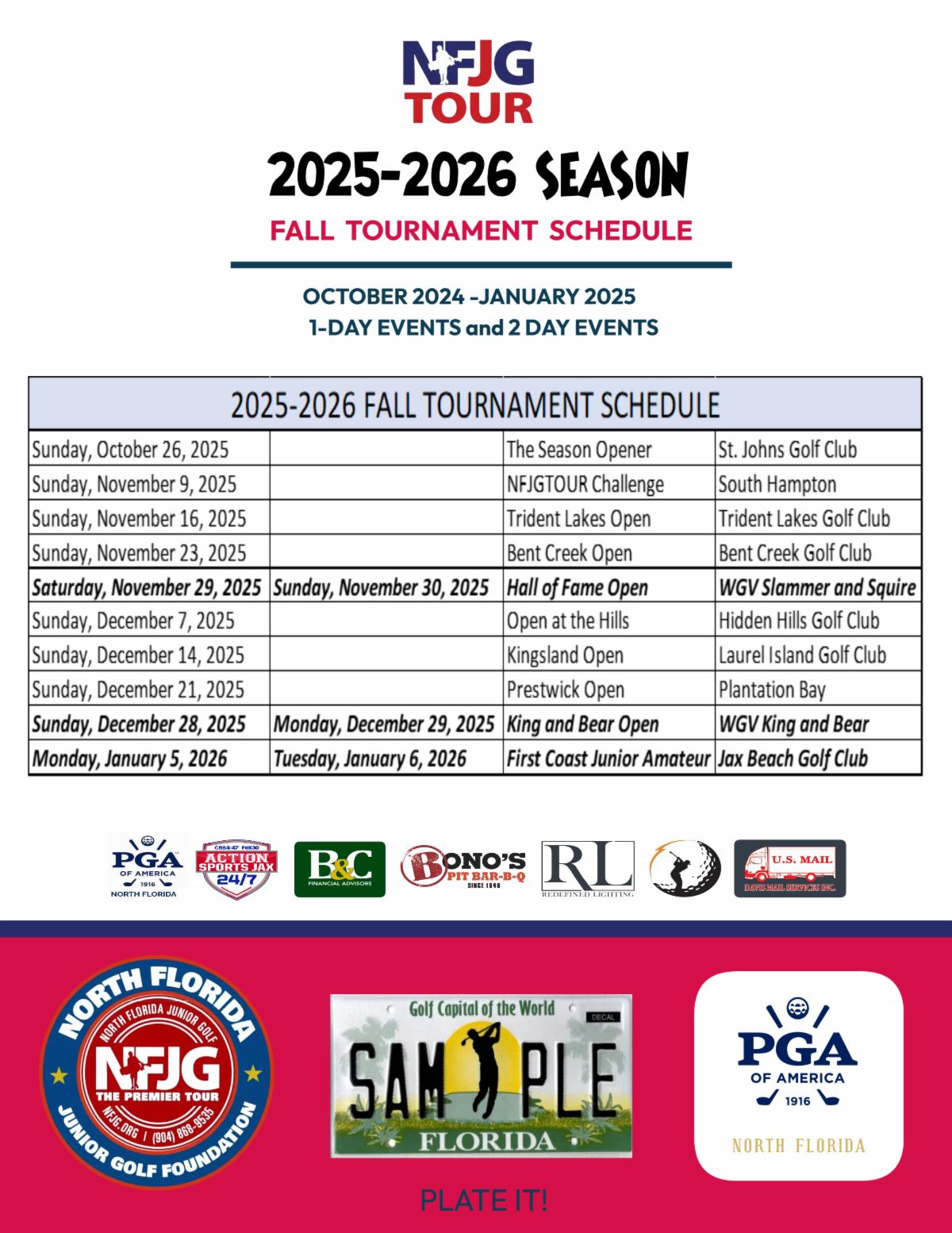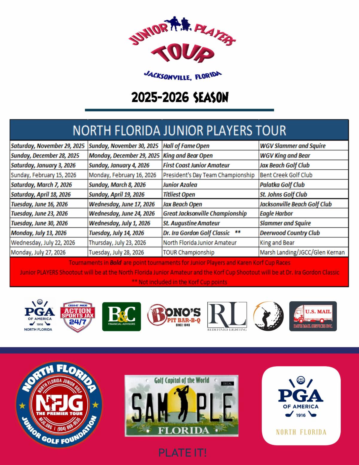 The 2025/2026 season will include events at TPC Sawgrass (Stadium and Pete Dye’s Valley), Atlantic Beach Country Club, Bent Creek Golf Club, Cypress Lakes Golf Club, Deerwood Country Club, Deercreek Country Club, Eagle Harbor Golf Club, Jacksonville Beach Golf Club, Jacksonville Golf and Country Club, King and Bear, Laurel Island Golf Club, Mark Bostick Golf Club, Marsh Landing Country Club, Palatka Golf Club, Ponte Vedra Inn & Club, Prestwick at Plantation Bay, Slammer & Squire, San Jose Country Club, St. John’s Golf and Country Club, St Johns Golf Club, The Golf Club at South Hampton, and Trident Lakes Golf Club.