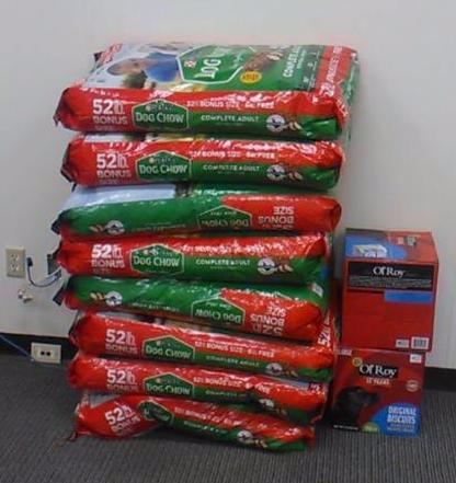 Dog food * Cat food * Cat litter * Collars * Leashes * Tarps * Dog treats * Paper or Styrofoam bowls * Kitten & puppy formula * Canned cat food & tuna * Flea & tick