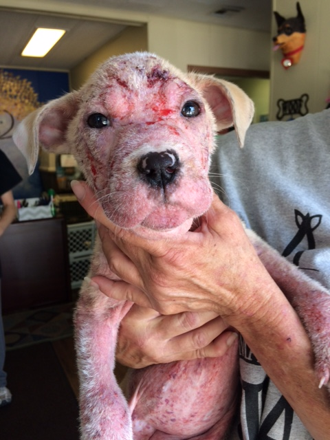 Above left - Puppy found in an alley is brought to ARF; Above right - ARF Founder Terri Panszi helps the healing begin; Right, Minxi is now living happily, loved and cared for in her forever home with her two sister-dogs.