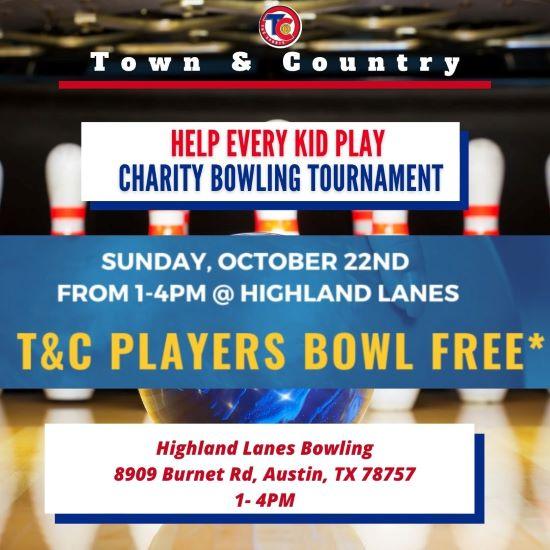 We have our βHelp Every Kid Playβ Charity Bowling Tournament scheduled for this Sunday October 22nd at Highland Lanes. This is our big fundraising event which raises money for our financial assistance program. If you have not already signed up, there is still time. Bring the whole family and come play with us. It is for a great cause and will be a lot of fun.