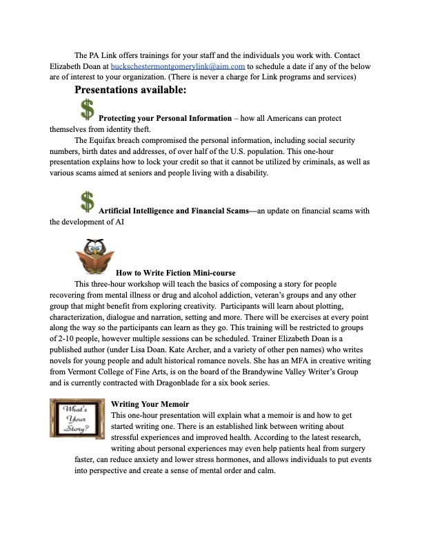 Please continue to keep us informed of what's happening with you in Bucks and Montgomery Counties. The information here comes from you, with links to our website for more complete information and resources. Send your events and updates to Kristyn: kristyn@bucksmontcollab.org. Thank you!