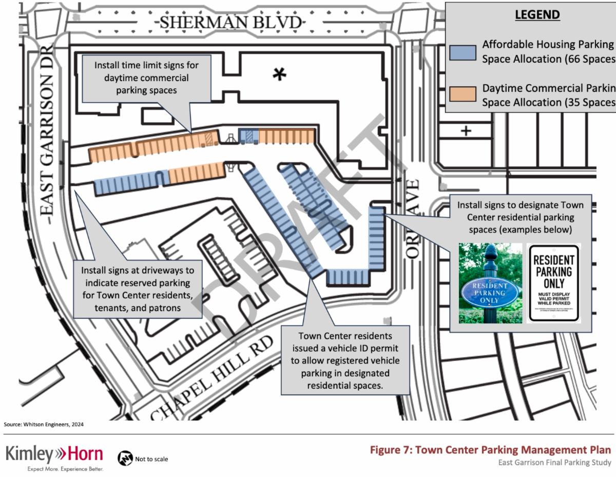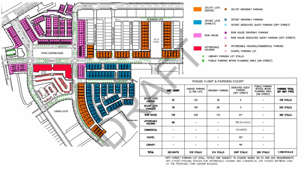 The county hired an independent firm to look at parking for the planned Town Center and Phase 4. Here are two draft maps the developer created. The first shows all the parking places (green dots) along EG streets. The second one shows that for the 66 apartments over the Town Center there will be one space per unit and 34 others to be shared between tenants and customers at the Town Center.