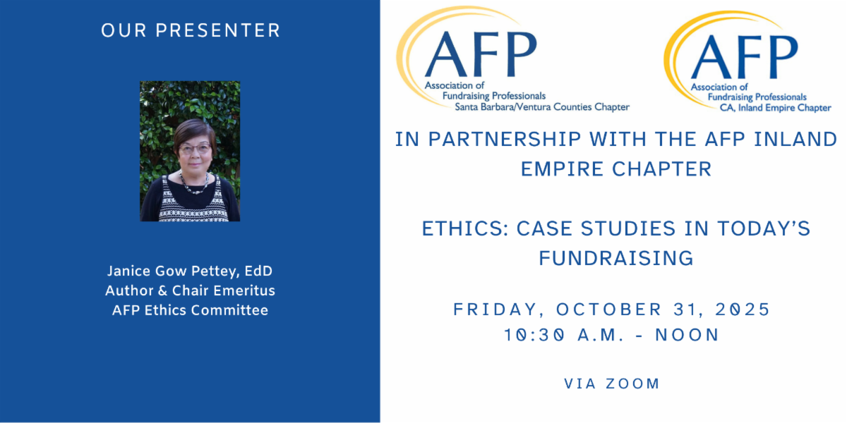 Finally, to our volunteers, committee members, and board—thank you for your time, talent, and steady leadership. As we like to say, many hands make the work light. Your service makes our chapter a catalyst for ethical, effective fundraising across Santa Barbara and Ventura Counties.