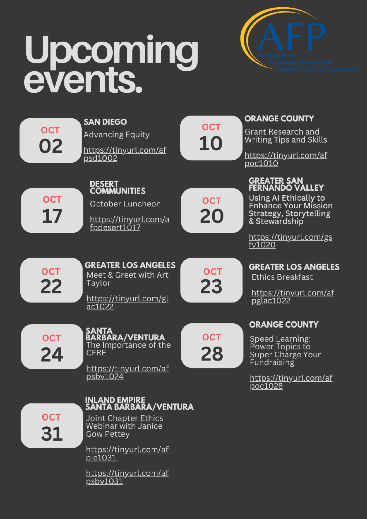 October is AFP Ethics Awareness Month. Ethical practice is our competitive advantage. If you haven’t already, register for our joint ethics program online on October 31—great content for your staff and your board.