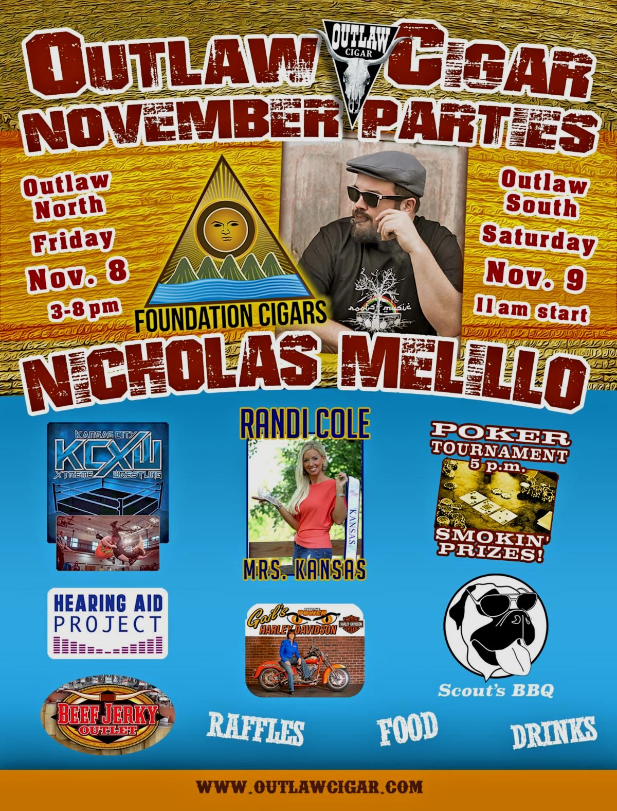 Welcome Nicholas Melillo back to the Outlaw at the November monthly parties! Cigars, great food, free beverages, poker tourney, deals and raffles!