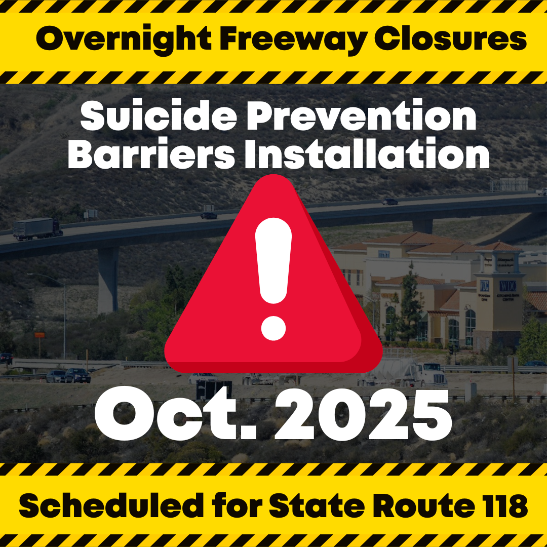 Ventura County – Caltrans announces overnight full freeway closures on State Route 118 (SR-118) between New Los Angeles Avenue and Princeton Avenue in Ventura County as part of a project to install suicide prevention systems along the Arroyo Simi Overhead Bridge. Beginning October 2025, SR-118 will have five full freeway closures through February for construction during overnight hours.