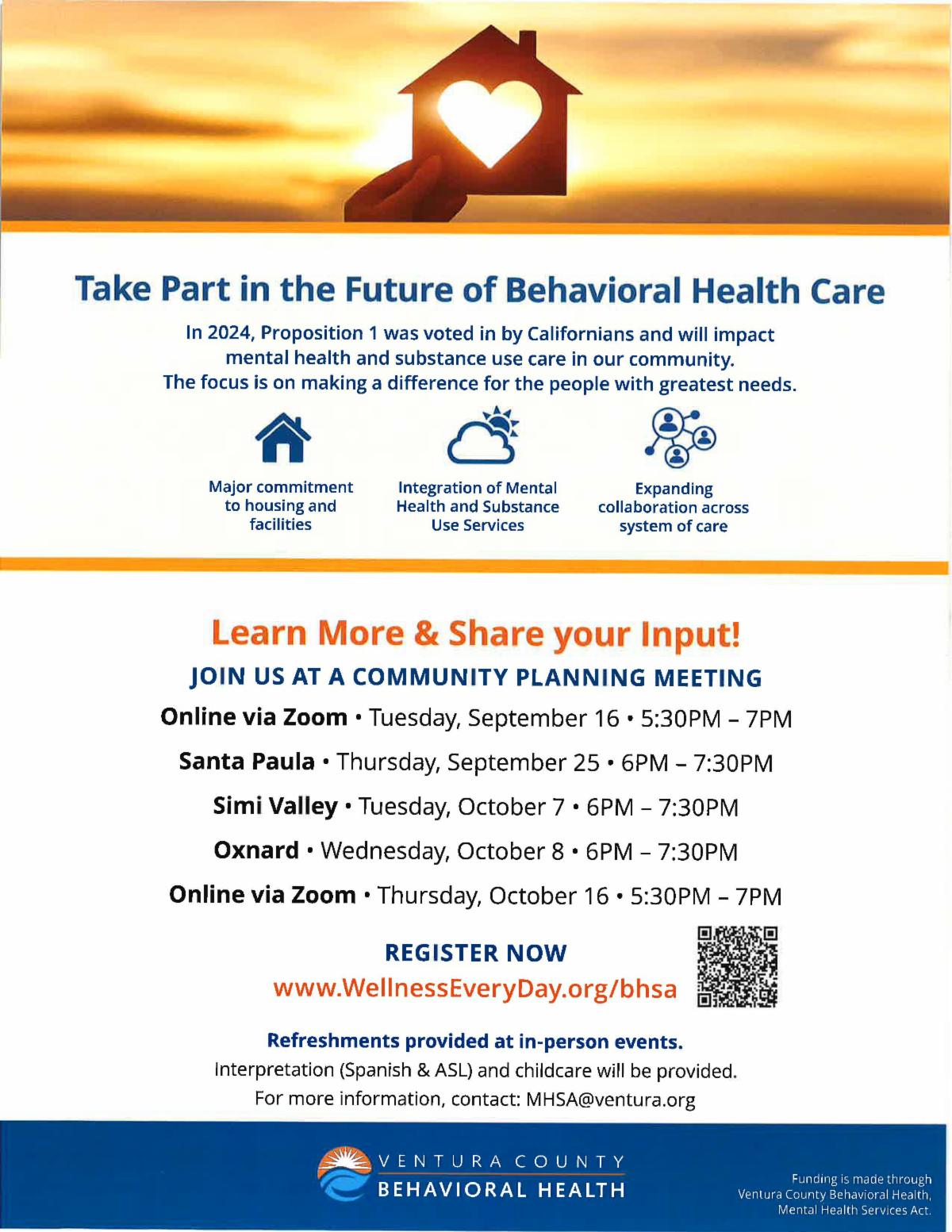 On Tuesday, October 7, Ventura County will host a community planning meeting in Simi Valley from 6:00 PM to 7:30 PM as part of the Behavioral Health Services Act (BHSA) outreach process, inviting residents to provide input on the MHSA Three-Year Plan 2023-2026.