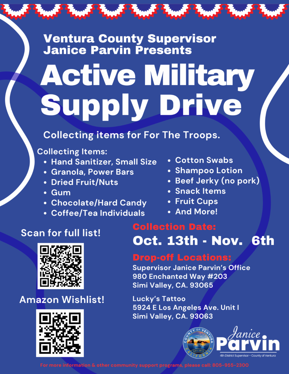 This October, my office is proud to host an Active Military Supply Drive in partnership with For The Troops, an organization dedicated to supporting our service members overseas. From October 13 through November 6, we will be collecting essential items such as hand sanitizer, granola and power bars, dried fruit, gum, coffee and tea packets, cotton swabs, shampoo, beef jerky, and other snacks to include in care packages for our troops. Donations can be dropped off at my district office in Simi Valley or at Lucky’s Tattoo. Every contribution, big or small, helps bring comfort and a reminder of home to the brave men and women serving our country.