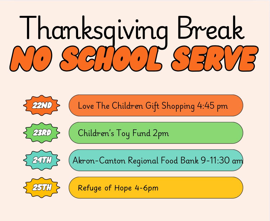 Get ready! Our students have a jam-packed volunteer calendar for both November and December. In addition to our regular rotation with our community partners, we have a MASSIVE "No School—Serve" weekend leading up to Thanksgiving this year!