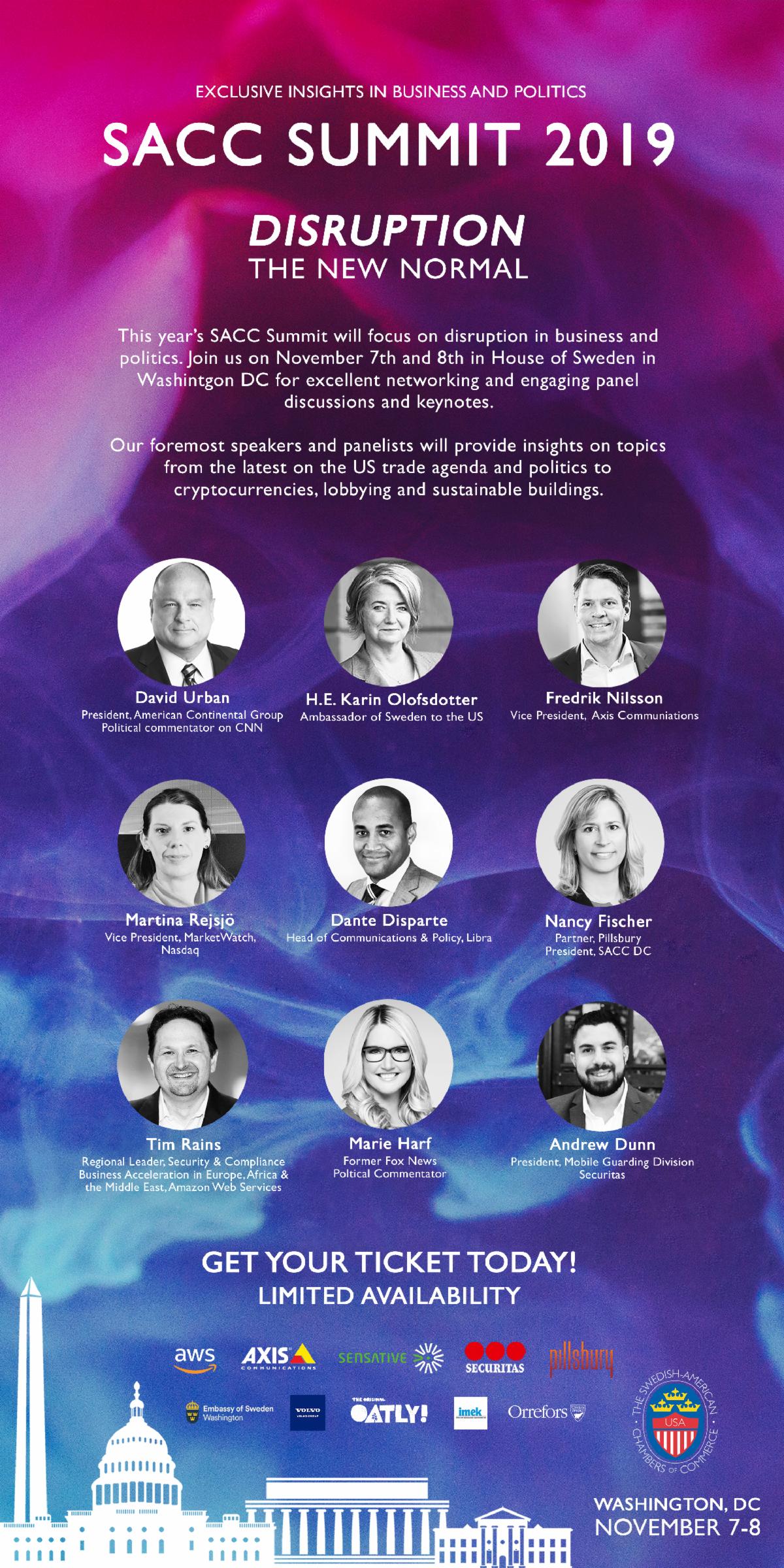 . We have some really interesting topics lined up for you, from “Protective Intelligence to Mitigate Risk” to “Repercussions of U.S. Trade Policy.” As always, SACC Summit features prominent speakers including David Urban, CNN Political Commentator; Martina Rejsjö, Nasdaq; Dante Disparte, Libra; and Tim Rains, Amazon Web Services. Register today and join us in intellectually stimulating and thought-provoking discussions.
