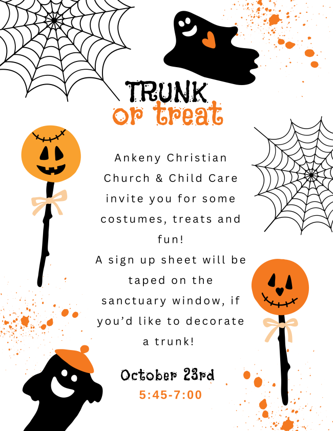 The Ankeny Child Care Center is joining with ACC in sponsoring a Trunk or Treat night on Wednesday, October 23 from 5:45 - 7:00 pm. Please help make this a fun night by decorating your trunk and handing out candy to the youth and children.