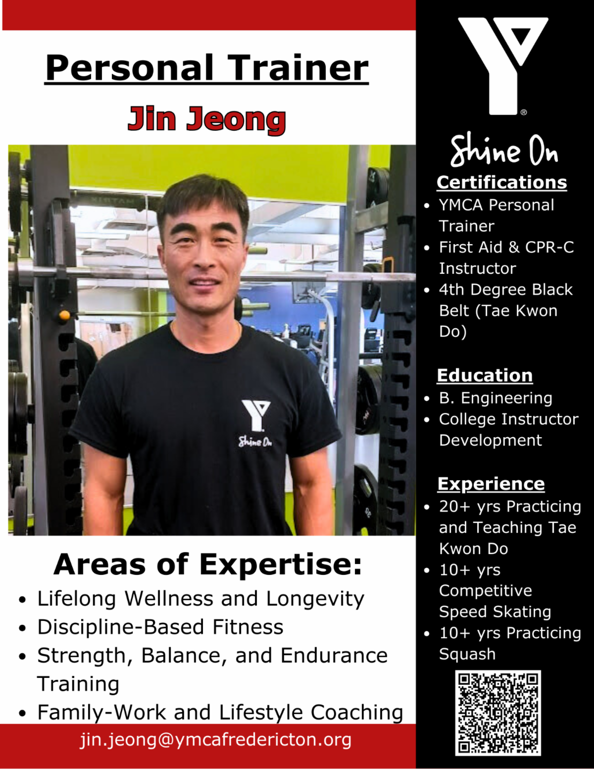 We welcome Jin Jeong to the personal training team! Jin has a 4th degree black belt in Tae Kwon Do and 20 +years of teaching Tae Kwon Do, 10+ years in the realm of Competitive Speed Skating, and 10+ years of playing squash. His areas of expertise include lifelong wellness and longevity, discipline-based fitness, strength, balance and endurance training as well as general life-style coaching. If you are interested in working with Jin, you can contact him at jin.jeong@ymcafredericton.org