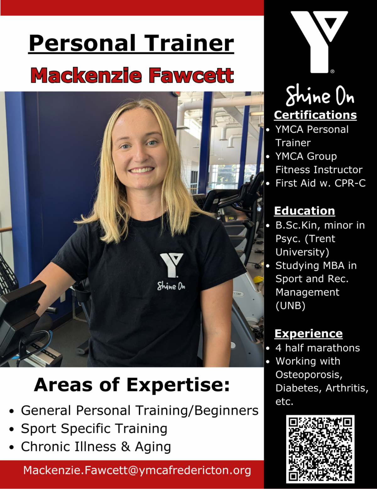 We're happy to have Mackenzie Fawcett join our team! Mackenzie offers personal training for those starting on their fitness journey,. She also offers sport specific training. She can create tailor made fitness regimes for those with chronic illness or age related barriers. For more information, please contact Mackenzie directly at mackenzie.fawcett@ymcafredericton.org