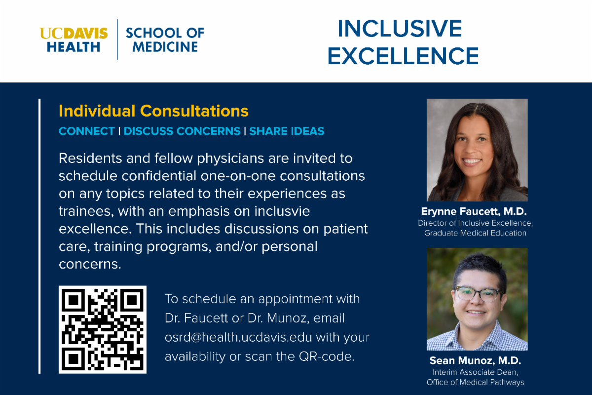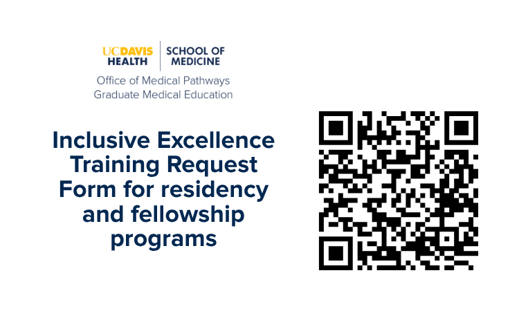 Residency and fellowship programs can now request Inclusive Excellence training session. These facilitated sessions address topics such as implicit bias, microaggressions, inclusive communication, and more, while also highlighting Graduate Medical Education resources and equity initiatives at UC Davis Health. Residency and fellowship program can request using the link here: https://ucdavis.co1.qualtrics.com/jfe/form/SV_bdYThunKpn7E0ZM or scanning the QR code.