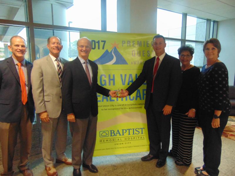 Leaders from Baptist Memorial Health Care Corporation in Memphis visited Baptist Memorial Hospital-Union City (BMH-UC) recently to present the 2017 QUEST Award for High-value Healthcare to the hospital’s staff on behalf of Premier Inc., a leading healthcare improvement company.