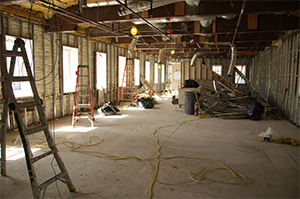 | | The basement is being prepped for the elevator installation and what will become the new kitchen and dining room. | | The second floor of the building has been completely gutted and the space shown here will become a new multi-purpose room and community partner room. | | |