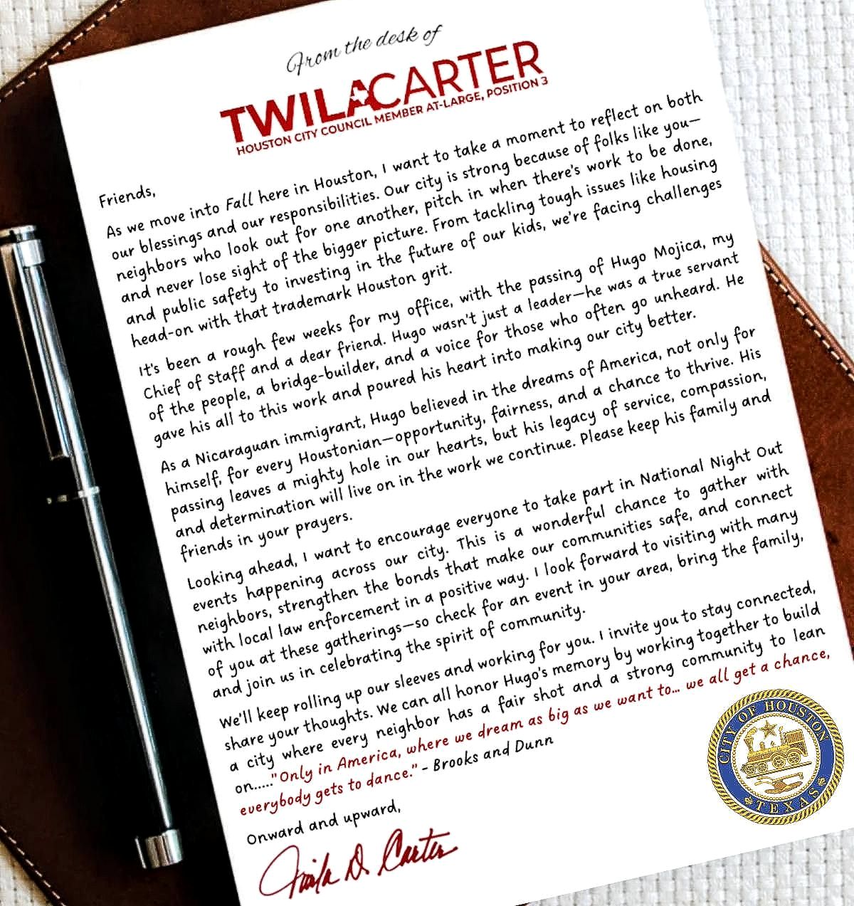 Council Member Carter extends her deepest thanks to JustServe Greater Houston, the City of Houston Office of Special Events, HPD, HFD, and all who made these moments of remembrance possible.