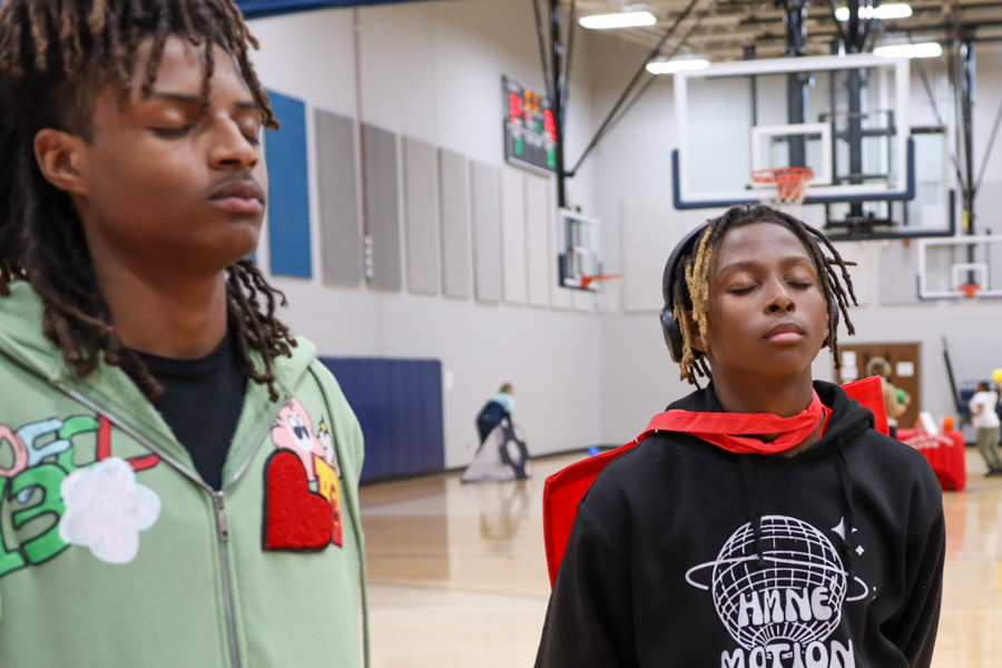 Two NorthStar students practice relaxation exercise. | Jackie Ostronic watches a NorthStar student participate in a pumpkin design contest. | |