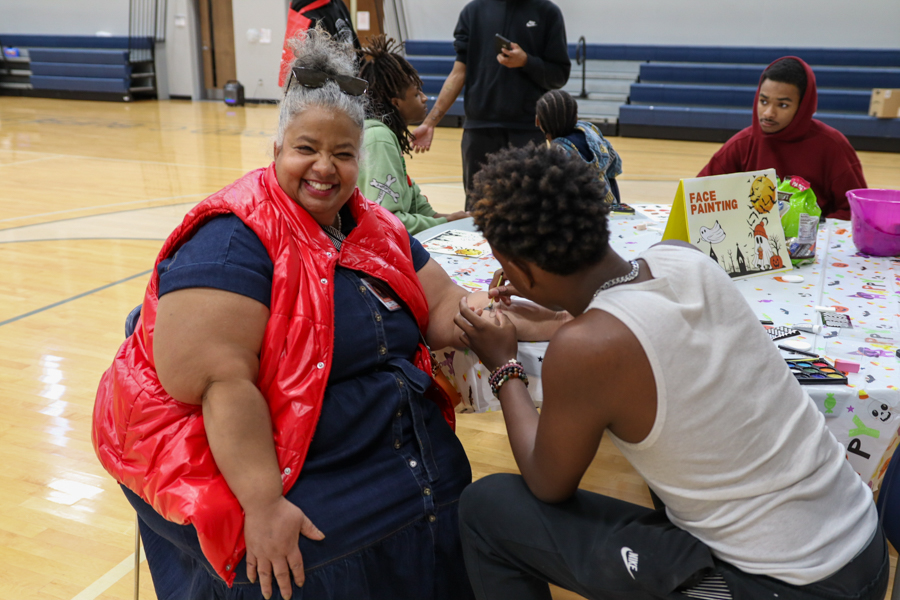 Ruben Quiros, MD, has a conversation with a NorthStar student. | Sharon Stoolman, MD, receives a Halloween "tattoo" from a NorthStar Student. | |