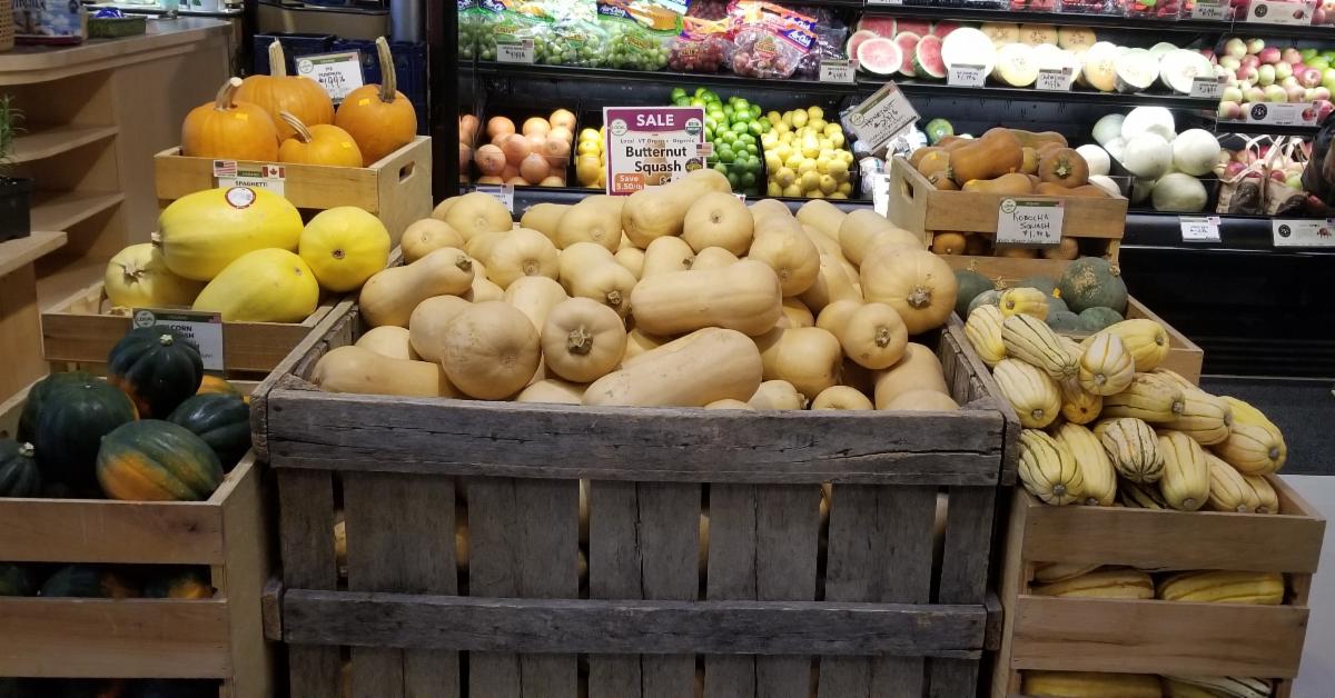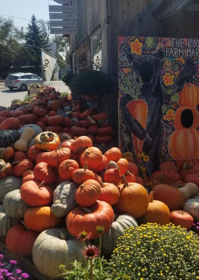 The bright Fall orange, red, & yellow colors of winter squash really help farmstands & Produce departments pop. All the crazy colors, shapes & textures make for a beautiful transition as seen in the Roots Farm Market picture above.