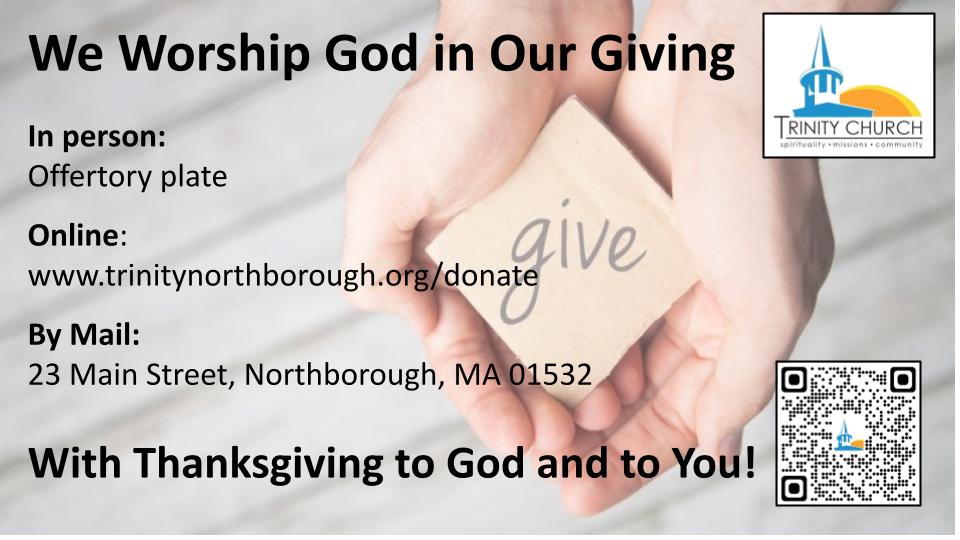 When you give, if you're paying by check, please make checks payable to Trinity Church. Our mailing address is 23 Main St, Northborough, MA 01532.