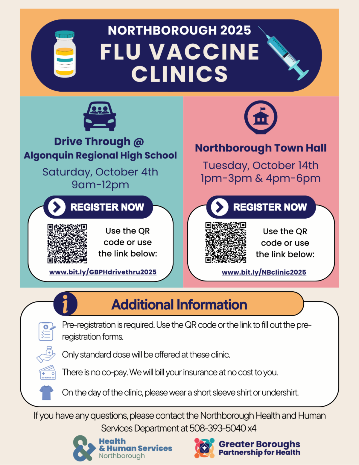 The Town of Northborough is hosting flu vaccine clinics. The clinics will be held on the following days and times: