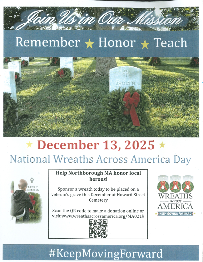 Northboro Junior Woman’s Club, Boros Cares 4 Troops and the Vincent F. Picard American Legion Post 234 will host Wreaths Across America on December 13, 2025 at 12:00 noon.