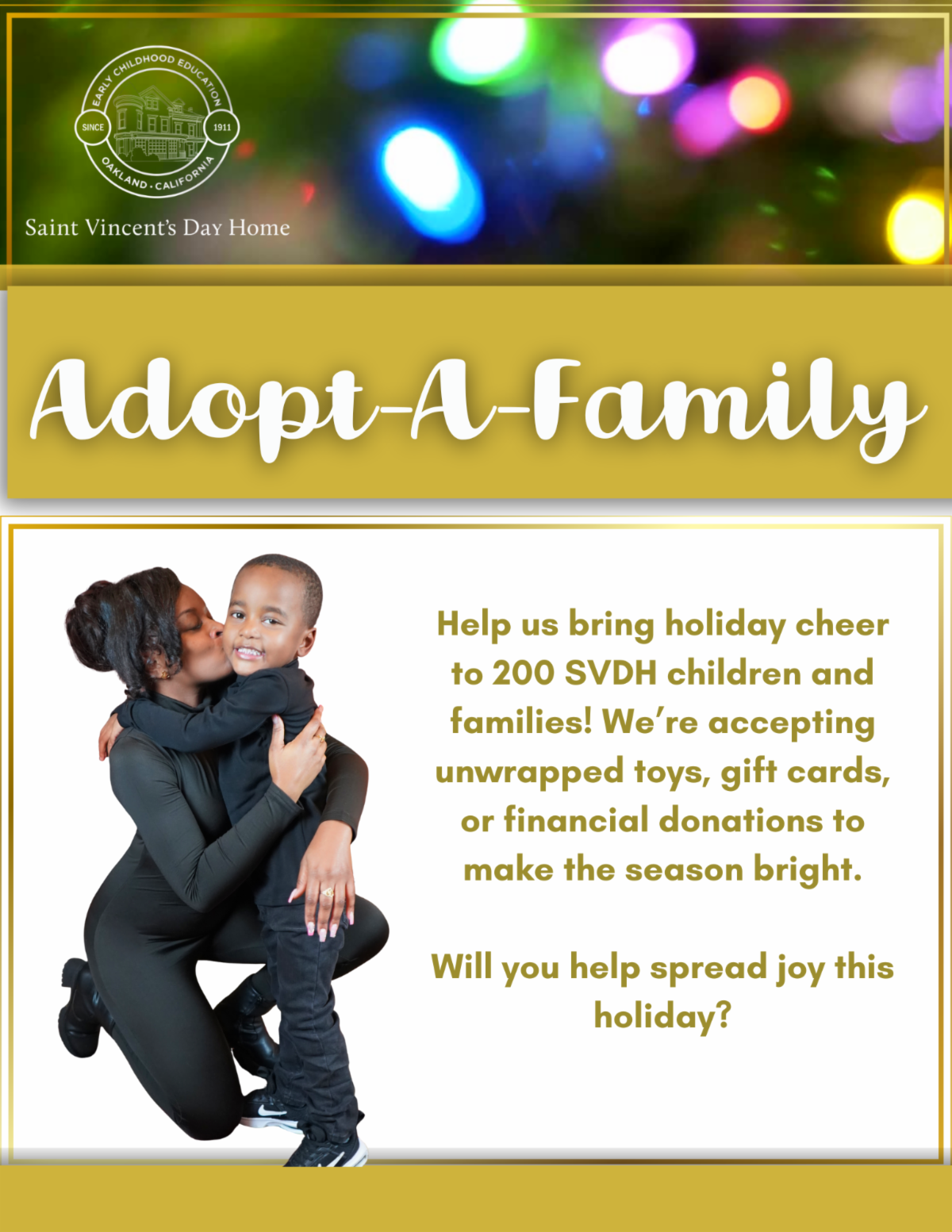 Our Adopt-A-Family gift drive is coming up! Each year, our generous community helps make the holidays brighter for our 200 SVDH children and their families. You can participate by donating gifts, gift cards, or adopting a family to provide gifts directly. Click the button below to adopt a family and help spread holiday cheer!