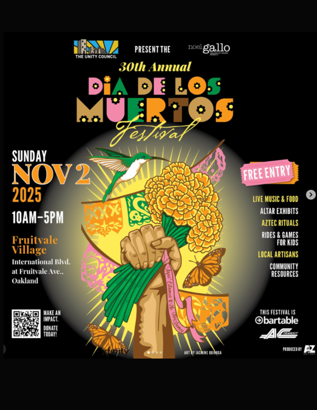 For 30 years, the Oakland Día de los Muertos Festival has celebrated Mexican traditions in the vibrant Fruitvale neighborhood with free, family-friendly activities, live music, artisans, and stunning community-created altares. This year’s festival, themed “Aquí estamos y no nos vamos,” will take place Sunday, November 2, from 10 AM to 5 PM on International Blvd between Fruitvale Ave and 42nd Ave, honoring resilience, unity, and cultural pride.