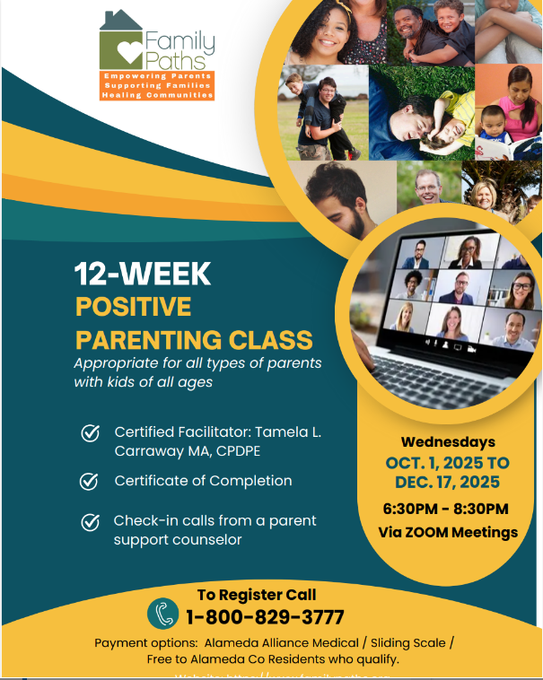 Join Family Paths' virtual Positive Parenting classes for parents and caregivers, offered in English and Spanish. Over 6, 10, or 12 weeks, you’ll learn tips on child development, effective communication, positive guidance, and strategies for managing stress and building strong family relationships. Classes run Wednesdays, Oct 1 – Dec 17, 2025, from 6:30–8:30 PM on Zoom. Call 1-800-829-3777 to enroll.