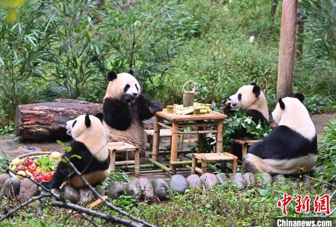 4-year-old giant panda twin brothers Jia Yang and Jia Bai, who are also fond of playing and frolicking in the mud, enjoyed a Weiqi, or Go-themed celebration specially designed by their keepers. During the celebration, the brothers, who are affectionately called "dirty buns" by netizens due to their "dirty yet cute" fur colors, climbed onto a perch filled with fruits, fresh bamboo, and specially-made "mooncakes", sniffed around, and then began to feast heartily, making a crisp crunch sound as they chewed on the bamboo.
