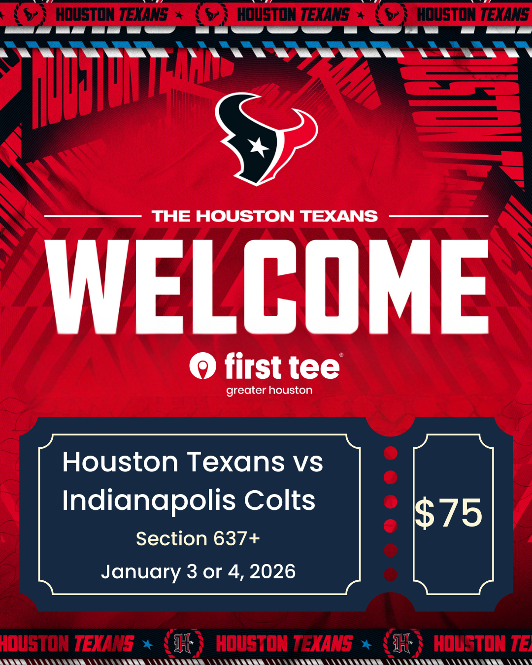 Cheer on the Texans as they take on the Indianapolis Colts on January 3 or 4, 2026. We're excited for the flex game! Bring your family and friends for a day full of excitement, energy, and memories with your First Tee community. If we have enough First Tee friends there, we might be able to take a picture on the field!