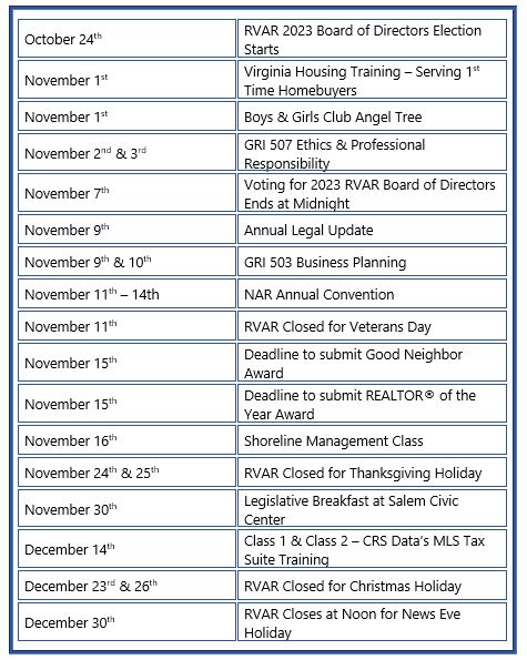 Legal Update: This annual session, offered by RVAR’s Education Committee in conjunction with Virginia REALTORS®, will be offered via Zoom on Wednesday, November 9th, 10AM-Noon. VAR General Counsel Laura Farley will address the following topic: