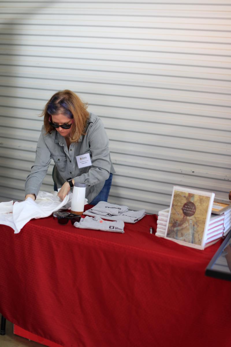 Board Member Pansy Price setting up the tee-shirt and book sale table.