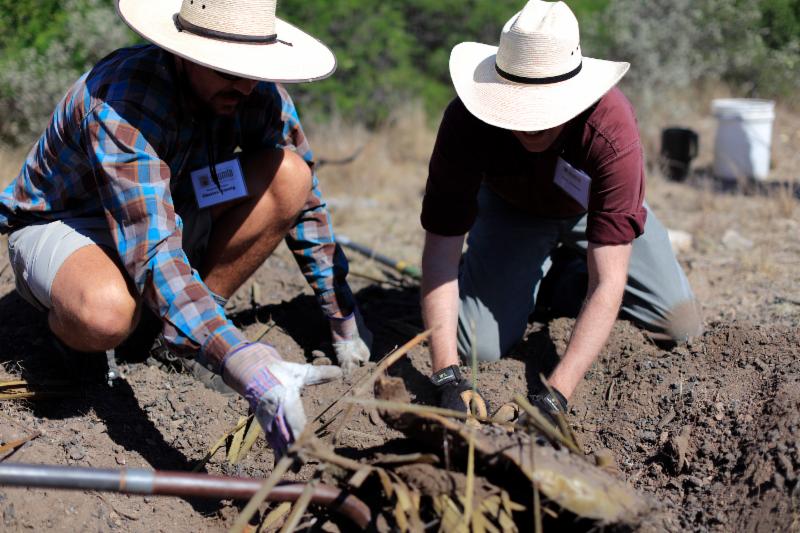 Board Member David Pipes shoveling the dirt off of the top of the earth oven to reveal the plants that had been cooking on hot rocks for two days.