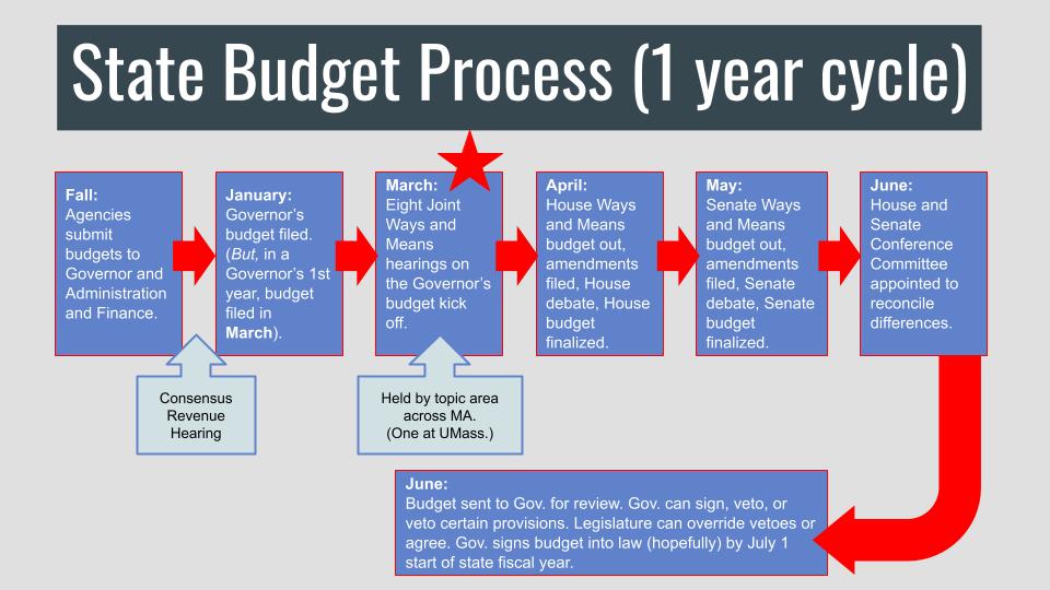 Our team put together a flow chart to help constituents track this process every step of the way. You can also track this online here: https://malegislature.gov/ (just click on “Budget” in the toolbar.)