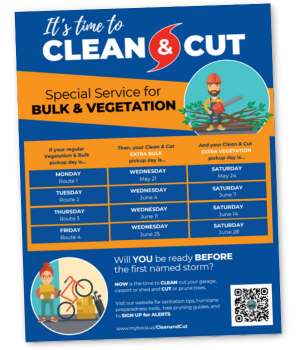 Start your hurricane prep with Clean & Cut to get ahead of the storms. Throughout the month of June, trim your trees and clean out garages, carports and storage areas. The City has FREE EXTENDED SERVICES for your BULK and VEGETATION pickup to help.