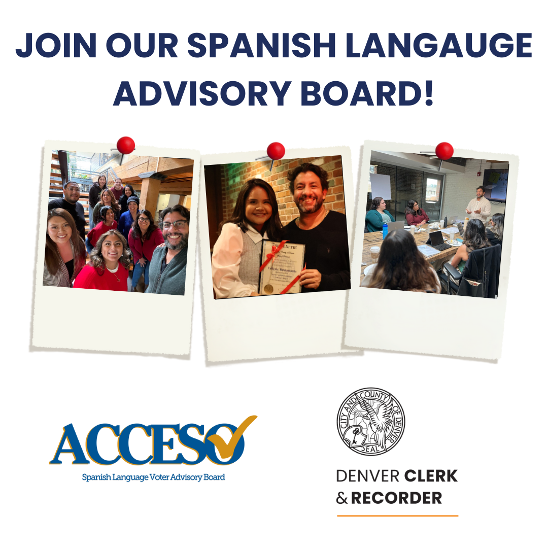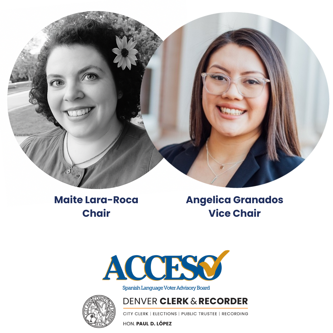 | | Join Our Spanish Language Advisory Board | | The Acceso Advisory Board guides the Denver Clerk & Recorder to administer elections that enhance voting access for Spanish-speaking communities, ensuring language support, civic inclusion, and adherence to voting rights laws. The Board's next meeting is set for March 18, and there's still time to join! | | Acceso recently named a new Chair and Vice Chair. Maite Lara-Roca and Angelica Granados are the new Chair and Vice Chair, respectively, for the advisory board. Maite is a federally certified Spanish court interpreter and is the first and presently only Spanish linguist at the Denver District Attorney's Office. Angelica is an advocate for political engagement within the Latino community in Colorado and was a Capitol Fellow for Colorado Latino Leadership Advocacy and Research. | | | | |