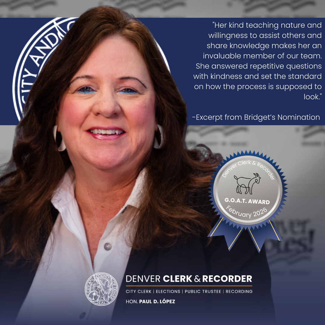 The Denver Clerk & Recorder Employee Engagement Committee is proud to recognize Bridget Svalberg, Denver Elections Admin Support Assistant, as our GOAT for February 2026!