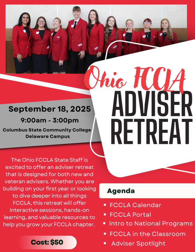 The Ohio FCCLA State Staff is excited to offer an adviser retreat that is designed for both new and veteran advisers. Whether you are building on your first year or looking to dive deeper into all things FCCLA, this retreat will offer interactive sessions, hands-on learning, and valuable resources to help you grow your FCCLA chapter.