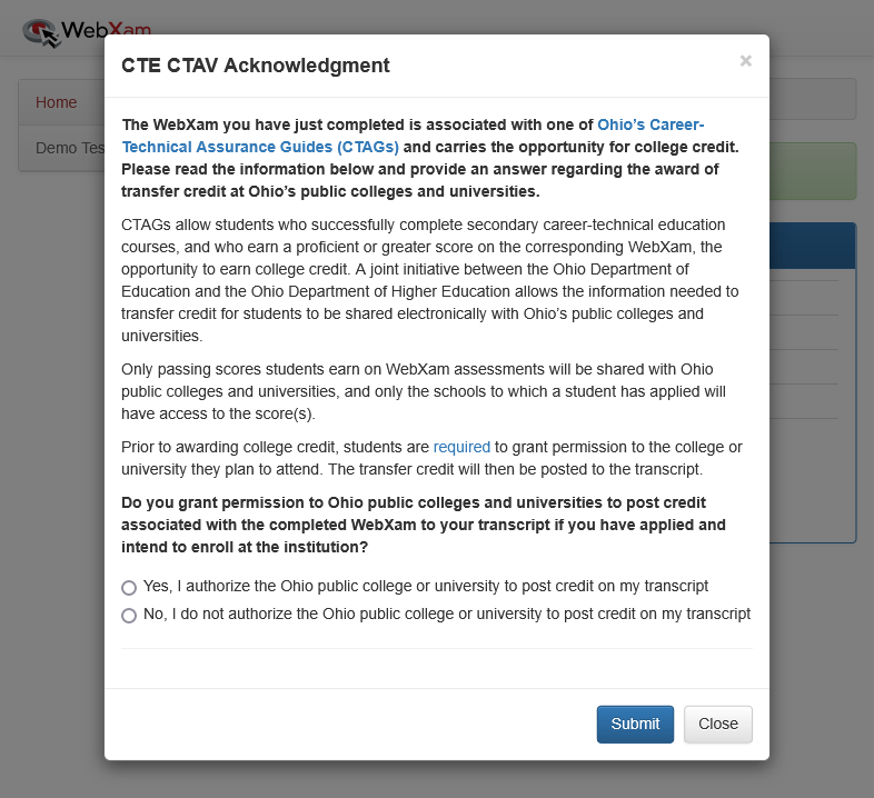The Center on Education and Training for Employment (CETE) in collaboration with the Ohio Department of Education and Workforce and Department of Higher Education, launched an end of test student acknowledgement survey, enhancing a students’ ability to access college transfer credit earned through one of Ohio’s Career-Technical Assurance Guides (CTAGs). The student survey appears at the completion of each WebXam test a student takes associated with one of Ohio’s Career-Technical Assurance Guides (CTAGs).