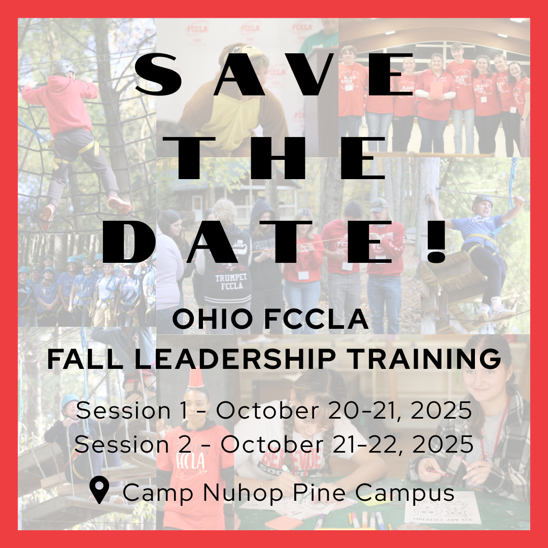 Fall Leadership Training is an exciting opportunity for Ohio FCCLA members and advisers to connect, collaborate, and grow. This statewide event focuses on developing strong leadership skills, strengthening team dynamics, and deepening your understanding of FCCLA programs. Through interactive workshops and hands-on activities, participants will gain practical tools and insights that translate directly into real-world success. Don’t miss your chance to be part of the Ultimate Leadership Experience, where inspiration meets action!