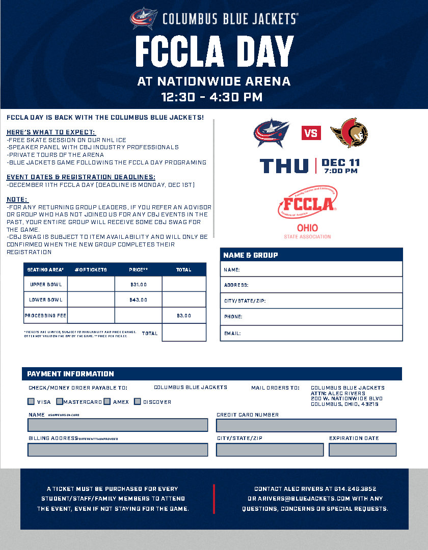 The Columbus Blue Jackets invite you to the annual FCCLA Day on Thursday, December 11, 2025. The event will include the chance to engage with an educational speaker panel, skate on the arena’s NHL ice, and a CBJ game following the event.