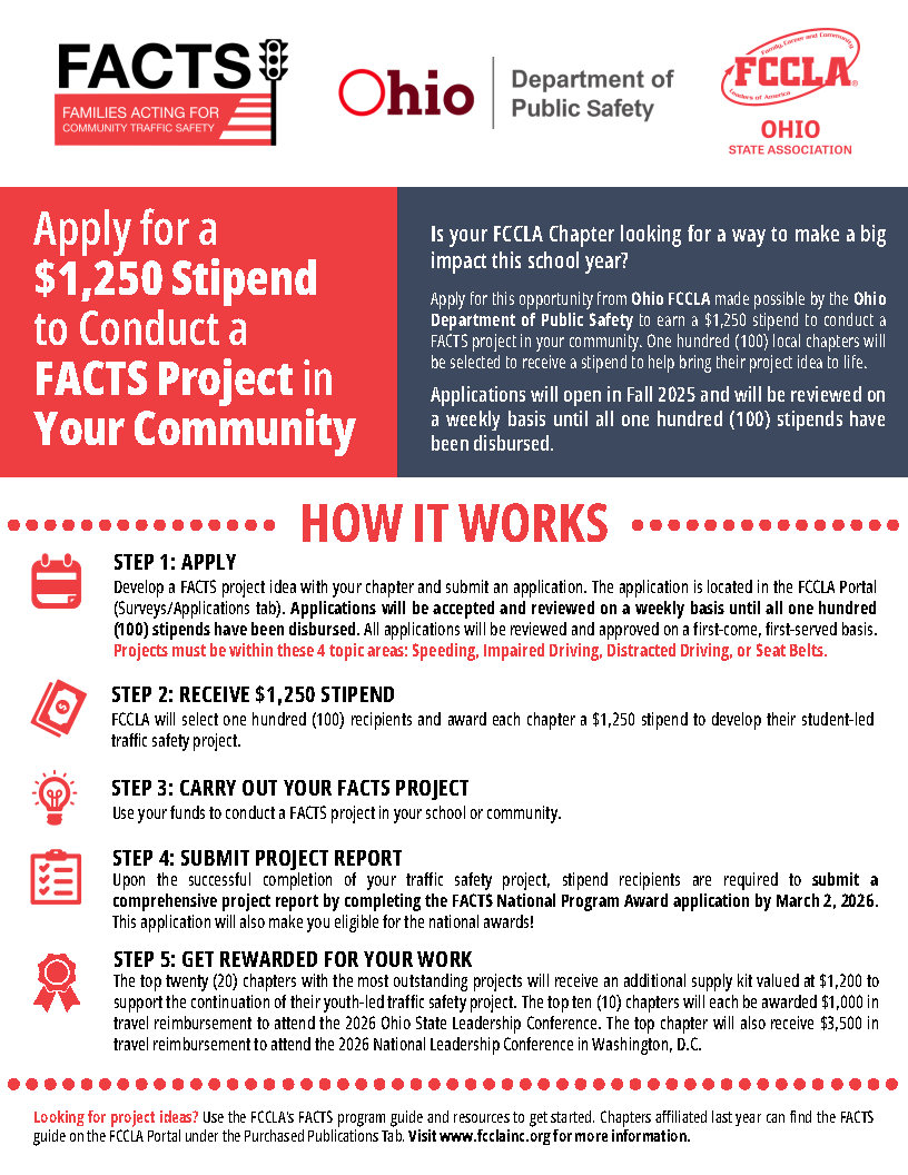 Ohio FCCLA and the Ohio Department of Public Safety are partnering to offer up to 100 Ohio FCCLA chapters a $1,250 stipend each to conduct a FACTS project in their community. Chapters interested in receiving the stipend must complete this application.