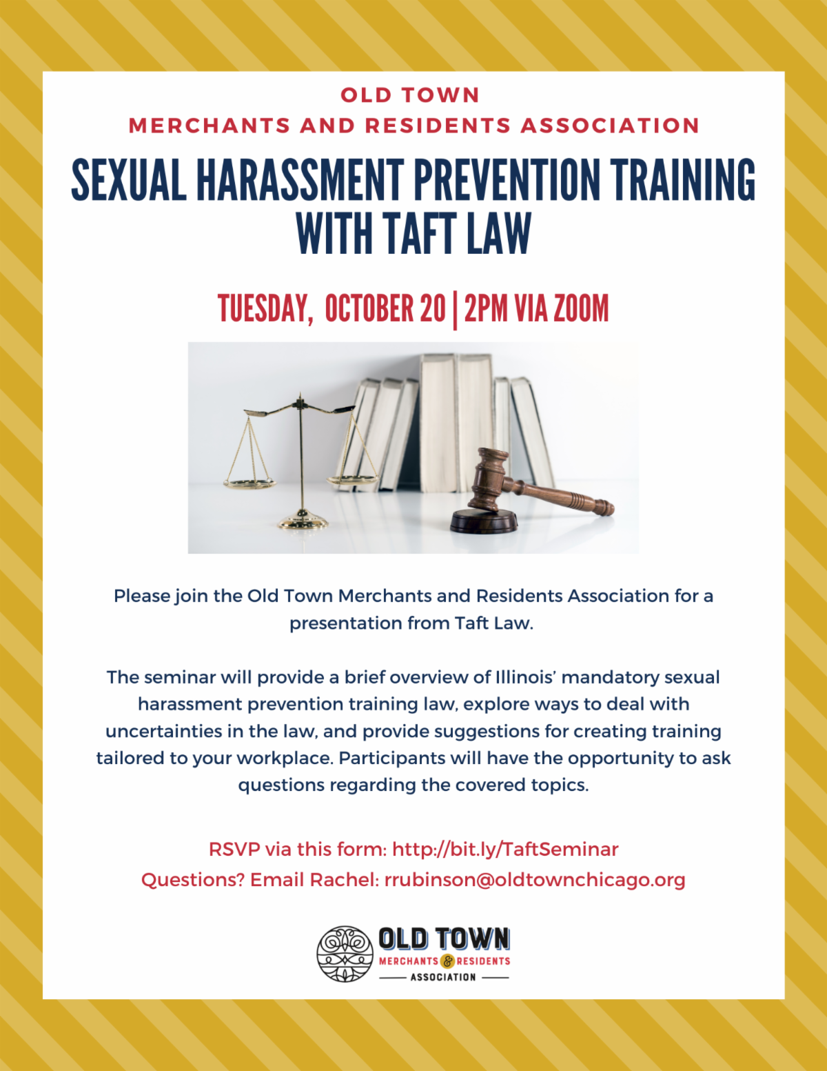 Please join the Old Town Merchants and Residents Association for a presentation from Taft Law. The seminar will provide a brief overview of Illinois’ mandatory sexual harassment prevention training law, explore ways to deal with uncertainties in the law, and provide suggestions for creating training tailored to your workplace. Participants will have the opportunity to ask questions regarding the covered topics.